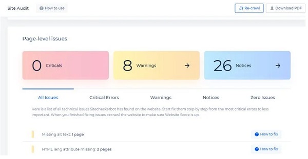 همچنین در گزارش Sitechecker ، مسائل بر مبنای میزان خطای موجود دستهبندی میشود و آنها را به صورت وخیم (Critical)، هشدارها (Warnings) و اعلانها (Notices) به شما ارائه میدهد. مشابه Nibbler میتوانید پس از بهروزرسانی سایت خود به صورت مجدد به کمک این ابزار به بررسی سایت خود بپردازید.