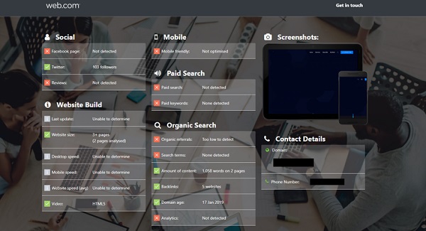 ابزار Web.com رابط کاربری بسیار خوبی دارد و تحلیل مختصری از سایت شما ارائه میدهد. مانند بقیه ابزارهای آنالیز مشکلات سایت، این ابزار نیز رتبهبندی سایت را بر مبنای نمره ۰ تا ۱۰۰ انجام میدهد.