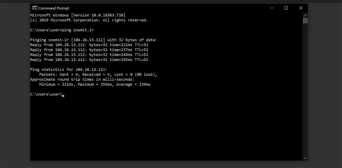 سه مرحلهی بالا، یک پینگ را تشکیل میدهد که اندازهگیری رفتوآمد پکت، مقدار پینگ خواهد بود. بهعنوان مثال، تصویر زیر اجرای دستور پینگ را برای وبسایت زومیت نشان میدهد. دستور مذکور چهار پکت داده را به سرور ارسال میکند و زمان رفتوبرگشت هر پکت را در یک خط نشان میدهد. درنهایت هم، گزارشی کلی از پینگ و مقدار میانگین آن مشاهده میکنید. برای اجرای این دستور و اندازهگیری پینگ اتصال به هر وبسایت کافی است خط فرمان ویندوز را از منو استارت و نوشتن عبارت cmd اجرا کنید. سپس در پنجرهی بازشده، دستور را با یک فاصله و سپس دامین کامل وبسایت هدف بنویسید؛ مانند ping zoomit.ir.