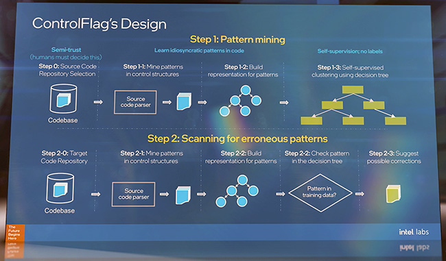 اینتل میگوید توانمندی بالای ControlFlag به خاطر استفاده از فناوری Machine Programming است که یادگیری ماشینی، روشهای صوری (Formal Methods)، زبانهای برنامه نویسی و کامپایلرها را ترکیب میکند. این ابزار تشخیص باگ با بیش از ۱ میلیارد خط کد آموزش دیده و الگوی برنامه نویسی عادی را از روی مثالها یاد گرفته و موارد غیرعادی که احتمال تبدیل شدن آنها به باگ وجود دارد را تشخیص میدهد.