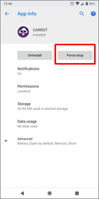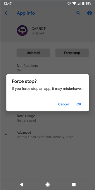 پس از پیدا کردن اپلیکیشن خود در لیست، ابتدا باید آن را متوقف کنید. برای این کار بر روی گزینهی «Force Stop» ضربه بزنید و در پیامی که نمایش داده میشود، گزینهی «OK» را برگزینید.