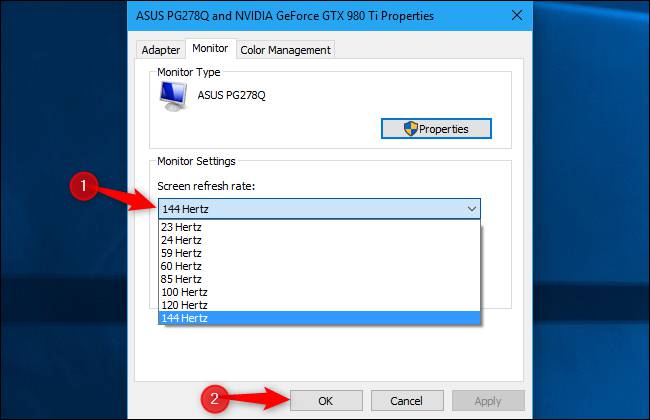 وارد زبانهی «Monitor» شده و رفرش ریت مورد نظر خود را از بخش «Screen Refresh Rate» انتخاب کنید. با کلیک بر روی گزینهی «OK» تغییرات شما ذخیره و اعمال میشوند.