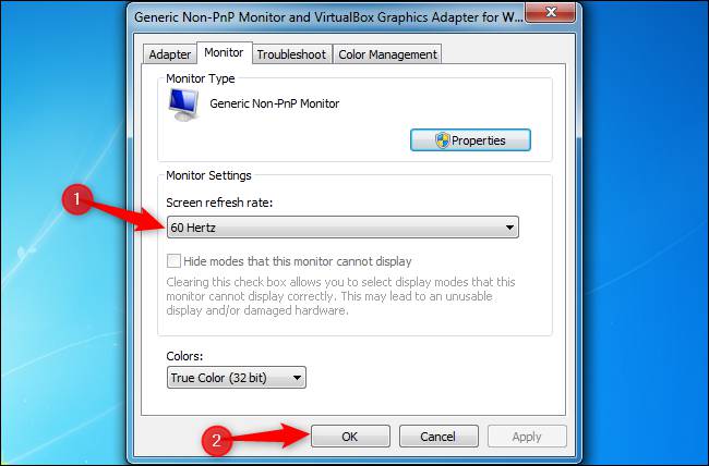 پس از نمایش پنجرهی «Properties» وارد زبانهی «Monitor» شده و سپس رفرش ریت مورد نظر خود را از بخش «Screen Refresh Rate» برگزینید. در نهایت بر روی «OK» کلیک کنید تا تغییرات شما فورا اعمال شوند.