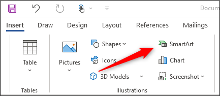 اولین از همه برنامه مایکروسافت ورد را اجرا کنید و در گروه Illustrations در تب Insert، روی گزینه SmartArt کلیک کنید.
