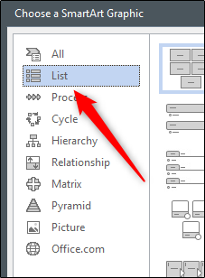 با اینکار، پنجره «Choose a SmartArt Graphic» در برابرتان ظاهر میشود. در صفحه سمت چپ، گزینهای را انتخاب کنید که امکان تایپ متن درون گرافیک SmartArt را ممکن کند. برای مثال در این مقاله از گزینه List استفاده میکنیم.