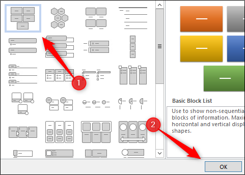 در ادامه گرافیک SmartArt موردعلاقهتان را از میان گزینههای موجود انتخاب کنید. برای مثال در این مقاله از گزینه «Basic Block List» استفاده میکنیم. پس از انتخاب گزینه موردنظرتان، روی دکمه OK کلیک کنید.