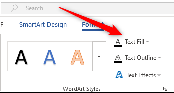 در گروه «WordArt Styles» که در تب فرمت ظاهر میشود، روی گزینه Text Fill کلیک کنید.