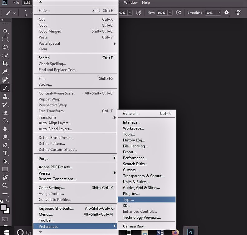 ابتدا برنامه فتوشاپ را باز میکنیم و در کادر بالای صفحهی برنامه کلمه “edit” را انتخاب میکنیم. پس از ورود به این زبانه، آخرین گزینه این بخش یعنی “preferences” را انتخاب میکنیم. روش دیگری که با آن میتوان وارد این بخش شد، استفاده از کلید “ctrl” و کلید “k”، یعنی “ctrl+k” میباشد که روش راحتتری است.