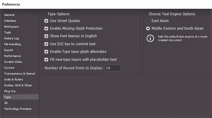 در این مرحله فارسی تایپ کردن در فتوشاپ مطابق تصویر بالا باید وارد بخش “Chosse Text Engine Options” شوید. همانطور که میبینید، در این بخش دو گزینه وجود دارد؛ یعنی گزینههای “East Asian” و “Middle Eastern and South Asian”، در صورتی که بخواهید در فتوشاپ فارسی تایپ کنید، باید گزینهی دوم، یعنی گزینهی “Middle Eastern and South Asian” را انتخاب کنید و در آخر روی کلمهی “ok” در سمت راست کادر کلیک کنید.