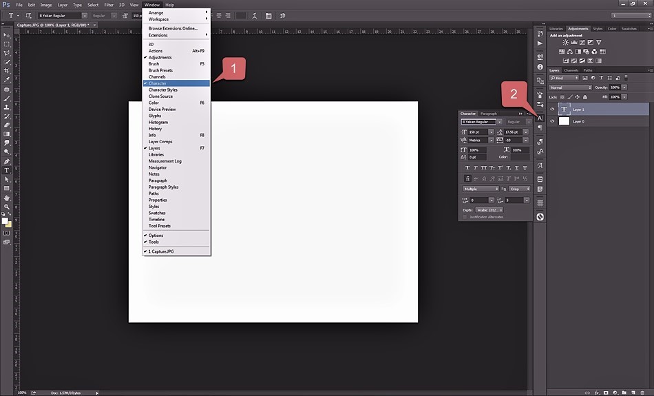 در این بخش قبل از هرچیز شما باید بخش “character” را در فتوشاپ فعال کنید تا دسترسی بیشتری به تنظیمات تایپ فارسی داشته باشید. در صورتی که این گزینه فعال نیست، مانند زیر عمل کنید.