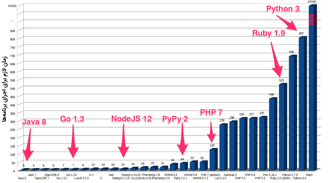 زبان | زمان (ثانیه) | حافظه (کیلوبایت) | قدرت پردازشی (پردازنده 4 هستهای) | |