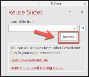 حالا با راست کلیک یک منو نمایان میشود. روی گزینه Browse کلیک کنید تا بتوانید از اینجا فایل پاورپوینتی که قصد ترکیب آن با پاور فعلیتان دارید را پیدا کنید.