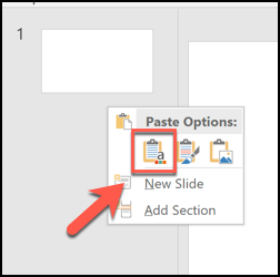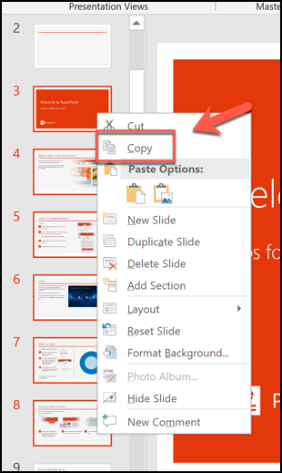 حالا اسلاید میزبان را باز کنید و مجددا به منوی سمت چپ رفته و نشانگر ماوس را روی نقطهای که خواهان پیست کردن اسلایدها در آن هستید ببرید. حالا در این قسمت راست کلیک کنید.