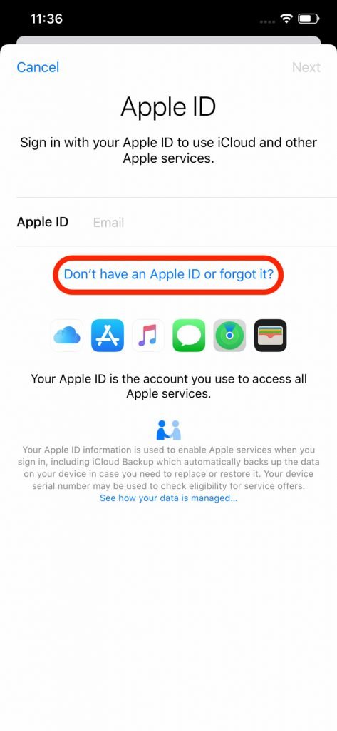 در منوی جدید عبارت ?Don’t have an Apple ID or forget it را انتخاب کنید.