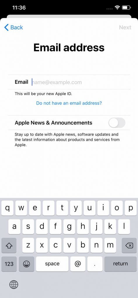 اکنون نوبت به ثبت ایمیل رسیده است. گزینهای که در قسمت پایین قرار دارد برای اطلاع رسانی به شما درباره اخبار و مسائل مرتبط با سرویسها و محصولات اپل طراحی شده که در صورت تمایل میتوانید آن را فعال کنید.