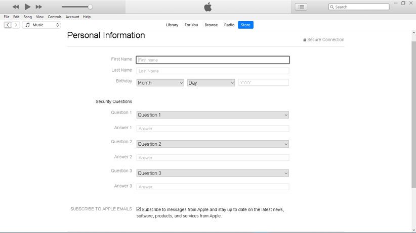در این قسمت از شما نام و نام خانوادگی، تاریخ تولد و سه سوال شخصی پرسیده میشود. این سه سوال در زمانی که با ورود به حساب خود مشکل داشته باشید به کمک شما خواهند آمد، بنابراین بهتر است پاسخهایی را انتخاب کنید که در آینده هم آنها را بهخاطر خواهید آورد. در قسمت پایانی گزینهای وجود دارد که تمایل شما به دریافت جدیدترین اطلاعیهها از محتوای iTunes را میپرسد.
