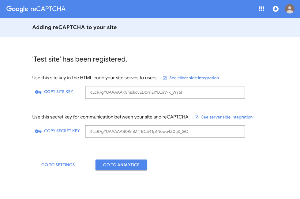 پس از ثبت نام site key و secret key به شما داده خواهد شد