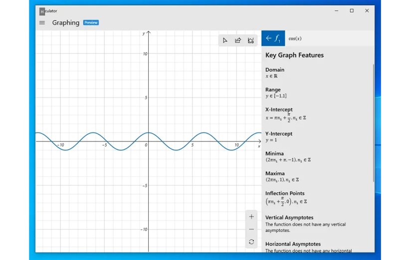 در کنار این قابلیتها، ماشین حساب جدید ویندوز ۱۰ میتواند ویژگیهای کلیدی نمودار شما را از جمله دامنه و برد تابع، نقطه تقاطع روی نمودار x، نقطه تقاطع روی نمودار y، ماکزیمم و مینیمم (بیشینه و کمینه)، نقطه عطف، خط مجانب افقی و عمودی و … را برایتان به نمایش بگذارد!