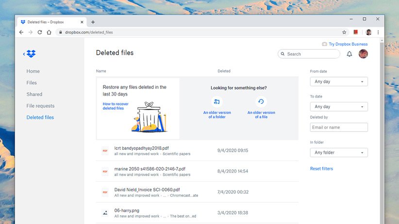 در رابطه با سرویسهای ذخیرهسازی ابری، باید بگوییم که بیشتر آنها از قابلیت بازیابی فایل های حذف شده بهره میبرند و البته این در حالی است که بکآپگیری خودکار را فعال کرده باشید. در مورد مثلا دراپباکس میتوانیم بگوییم که با مراجعه به این برنامه، میتوانید به بخش Deleted Files سر بزنید تا فهرستی از فایلهای و پوشههایی که اخیرا حذف شدهاند را مشاهده کنید. سپس با کلیک بر گزینه Restore میتوانید این موارد را برگردانید. در اشتراکهای معمولی و پلاس این فایلها ۳۰ روز در سرور ذخیره میشود و اگر از حالت حرفهای استفاده میکنید، مدت دوام آنها در سرورهای دراپباکس به ۱۸۰ روز میرسد.