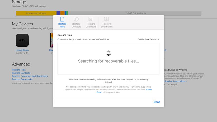 اگر اطلاعات iOS با آیکلاود سینک شده باشد و به طور مرتب بکآپ گرفته شود، از طریق صفحه وب آیکلاود میتوانید به دادههای مختلفی دسترسی پیدا کنید. با مراجعه به این صفحه وب، بر Account Settings و سپس در بخش Advanced بر Restore Files کیک کنید تا بتوانید فایلها، فهرست مخاطبین، اطلاعات تقویم و بوکمارکهای سافاری را بازیابی کنید.