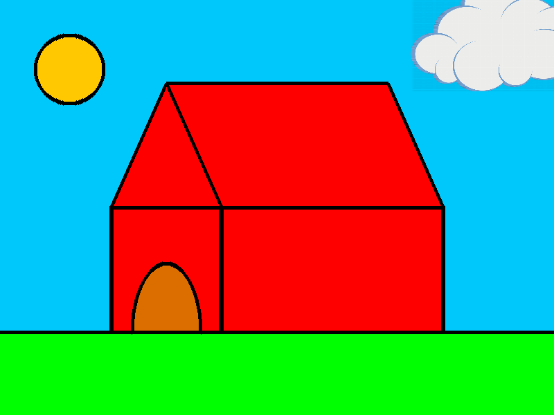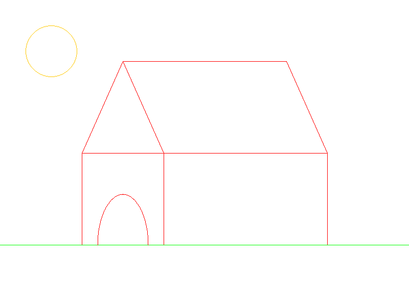 ما در مثال زیر از همه تابعهایی که تا به این جا معرفی کردیم برای ایجاد یک رسم از کلبه، خورشید و زمین استفاده کردهایم.