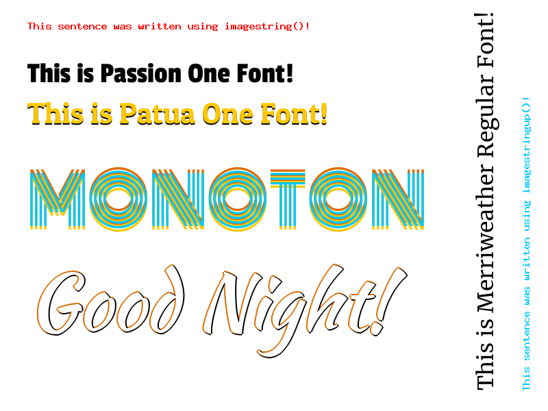 imagettftext($img, 32, 0, $img_width/20, $img_height*2/10, $black, $passion_one, 'This is Passion One Font!');