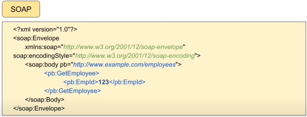 وقتی سخن از نحوه ایجاد وب سرویسها به میان میآید، دو رویکرد رقیب مطرح است. این دو رویکرد SOAP و REST نام دارند. همواره پیرامون رقابت میان SOAP و REST بحثهای جدی در گرفته است. برای شرح تفاوت SOAP و REST بهتر است نحوه ارسال درخواست در هر کدام مورد بررسی قرار بگیرد. به عنوان مثال در صورتی که قصد دسترسی به جزئیات اطلاعات یک کارمند با شناسه ۱۲۳ وجود داشته باشد، درخواست در وب سرویس SOAP مشابه تصویر زیر خواهد بود:
