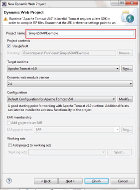 در مرحله اول باید یک پروژه وب پویا ایجاد و نامگذاری شود. میتوان مطابق تصویر زیر، نام آن را SimpleSOAPExample انتخاب کرد: