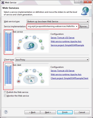 با کلیک روی گزینه Next به مرحله بعدی رفته و مطابق تصویر زیر، در قسمت «Service Implementation» باید نام کامل (Fully Qualified) کلاس HelloWorld که پیش از نوشته شده است را وارد کرده و هر دو اهرم مربوط به Test Service و Test Client را روی آخرین درجه قرار داد و در نهایت Finish را زد.