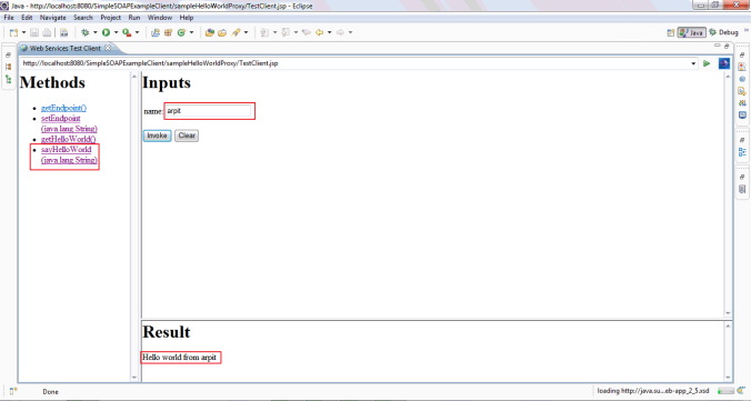 در این بخش، به ارائه مثالی از وب سرویس SOAP در جاوا پرداخته شده است. یک مثال ساده (Hello World) که در Eclipse پیادهسازی خواهد شد. Eclipse امکانات (API) مطلوبی برای ایجاد وب سرویسها فراهم میکند. Eclipse بیشتر کارها را به صورت خودکار انجام میدهد و Endpointها (نقاط انتهایی)، Stubها، WSDL و سایر موارد را ایجاد میکند. در ادامه، هر یک از مراحل ایجاد وب سرویس SOAP در جاوا ارائه شده است