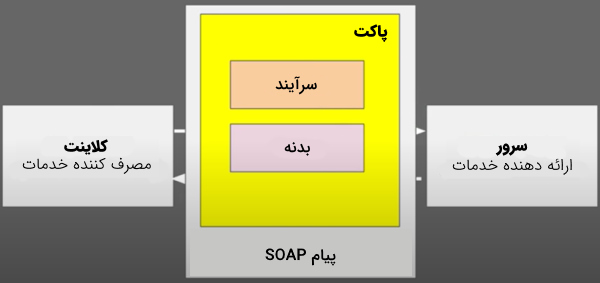 در خصوص مفاهیم ارتباط کلاینت-سروری، کلاینت به عنوان مصرفکنندهخدمات (سرویس) و سرور به عنوان ارائهدهنده خدمات شناخته میشوند. مصرفکنندهو ارائهدهنده سرویس از طریق وب سرویسها با هم در ارتباط هستند. پروتکل SOAP بیان میدارد که تمام عملیات تبادل داده، پیام یا اطلاعات بین دو اپلیکیشن کلاینت و سرور باید در یک قالب (Format) مشخصی انجام شود. این قالب مشخص در پروتکل SOAP قالب XML است. بنابراین تمام اطلاعات و پیامها باید از طریق یک قالب مشترک رد و بدل شوند. قالب مشترکی که SOAP از آن استفاده میکند، XML است. اما این تبادل اطلاعات نمیتواند تنها به صورت یک فایل XML ساده باشد. در واقع «پیام XML» باید یک «پیام SOAP» باشد. اما پیام SOAP چیست و چه ویژگیهایی دارد؟ در ادامه به این مسئله پرداخته شده است.