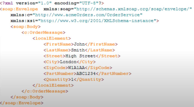 پیام SOAP شامل یک پاکت نامه است که به عنوان عنصر ریشه شناخته میشود. در داخل پاکت، به صورت اختیاری میتوان یک سرآیند داشت. در سرآیند اطلاعات مختلفی پیرامون انواع پیچیده (Complex Type)، تایید اعتبار، مسیریابی و موارد دیگر وجود دارد. به طور کلی در عنصر سرآیند اطلاعاتی پیرامون پیام SOAP ارائه میشود. علاوه بر سرآیند، یک بدنه هم وجود دارد. این بدنه شامل محتوای درخواست ارسالی است. بنابراین، تمام پارامترهایی که قصد ارسال آنها به عنوان یک درخواست وجود دارد، در بدنه گنجانده میشود. در ادامه، مثالی از یک پیام SOAP برای درک بهتر اجزاء و ساختار پیام SOAP آمده است.