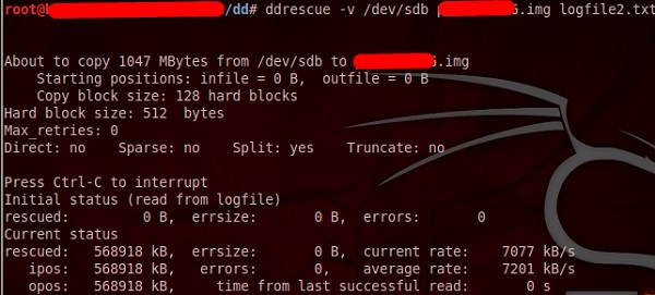پارامتر v- به معنی حالت توضیحی (verbose) است. /dev/sdb پوشهای است که باید نجات یابد. img file نیز ایمیج احیا شده است.