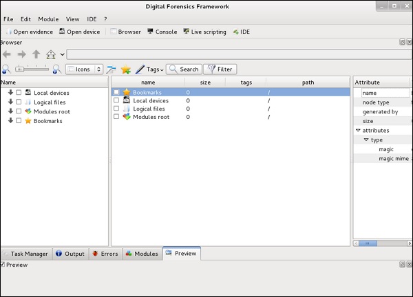 این نیز یکی دیگر از ابزارهای جرمشناسی کالی لینوکس است که برای بازیابی فایلها مورد استفاده قرار میگیرد. DFF یک GUI نیز دارد. برای باز کردن آن دستور dff-gui را در ترمینال وارد کنید تا رابط کاربری گرافیکی وب زیر برایتان باز شود.
