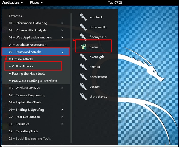 برای باز کردن هیدرا به بخش اپلیکیشنها رفته و روی Password Attacks و سپس روی Online Attacks و در ادامه hydra کلیک کنید.