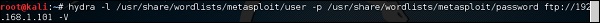 /usr/share/wordlists/metasploit/ passwords ftp://192.168.1.101 –V