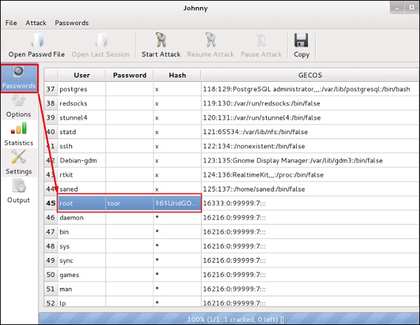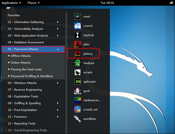 Johnny یک GUI برای ابزار کرک رمز عبور John the Ripper است. به طور کلی این ابزار برای رمزهای عبور ضعیف مورد استفاده قرار میگیرد. برای باز کردن این ابزار به مسیر اپلیکیشنهای کالی رفته و روی Password Attacks و سپس روی johnny کلیک کنید.