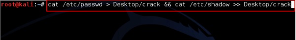 در این مورد ما رمز عبور رایانهای که کالی روی آن نصب شده را با دستور زیر بازیابی کرده و در یک فایل روی دسکتاپ ذخیره میکنیم: