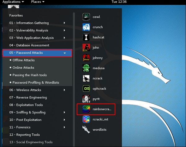 برای باز کردن این ابزار به بخش اپلیکیشنها رفته و روی Password Attacks و سپس rainbowcrack کلیک کنید.