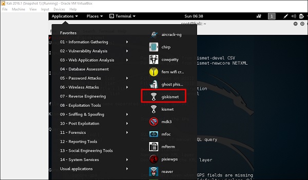 گام اول: برای باز کردن GISKismet به مسیر Applications بروید و روی Wireless Attacks و سپس giskismet کلیک کنید.