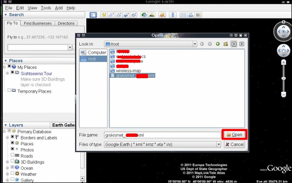 گام سوم: اگر فرض کنیم قبلاً گوگل ارث روی سیستم نصب شده است، میتوانیم به مسیر File → Open رفته و پس از انتخاب فایلی که Giskismet ایجاد کرده است روی دکمه Open کلیک کنیم.