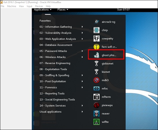 گام اول: برای باز کردن این ابزار به مسیر Applications رفته و روی Wireless Attacks و سپس ghost phishing کلیک کنید.