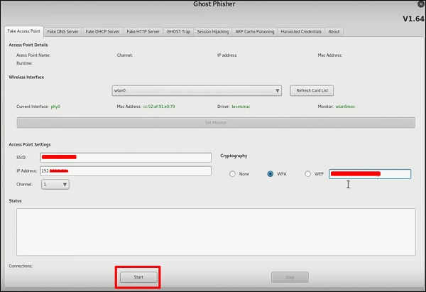 گام دوم: پس از آن که ابزار ghost phishing باز شد، یک AP جعلی با جزییات زیر میسازد:
