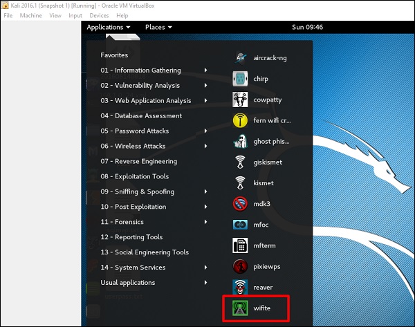 گام اول: برای باز کردن این ابزار به مسیر Applications رفته و روی Wireless Attack و سپس Wifite کلیک کنید.