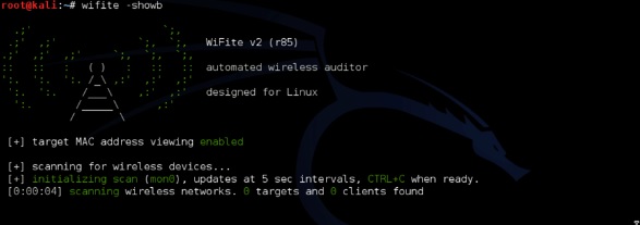گام دوم: عبارت wifite –showb را وارد کنید تا شبکههای موجود اسکن شوند.