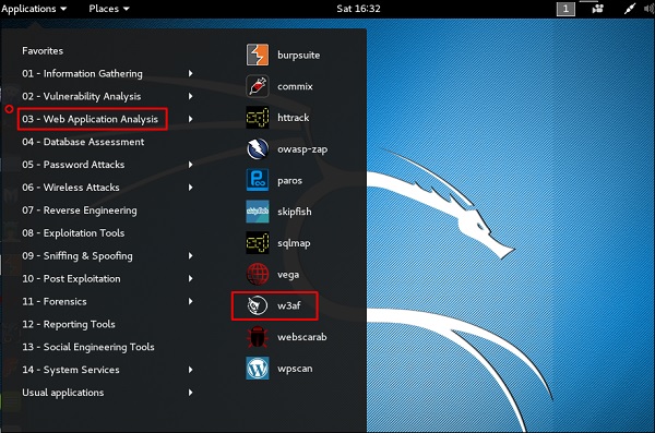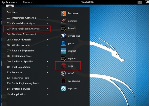 گام اول: برای باز کردن وگا به مسیر Applications رفته و روی 03-Web Application Analysis و سپس Vega کلیک کنید.