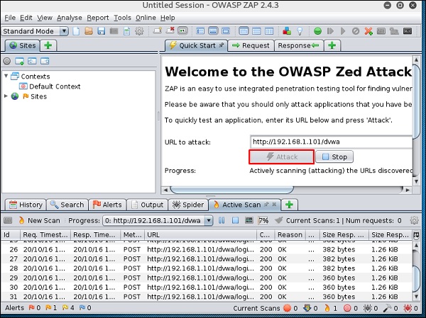 گام چهارم: URL وبی که باید تست شود را در کادر URL to attack وارد کرده و روی Attack کلیک کنید.