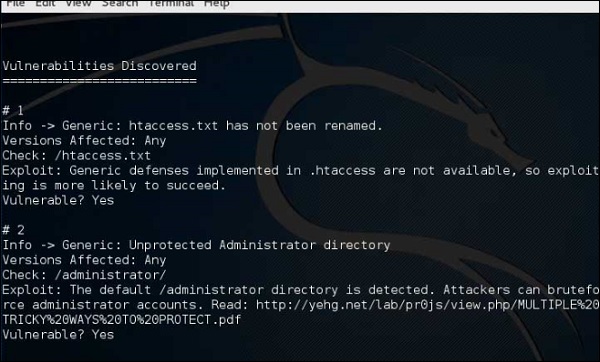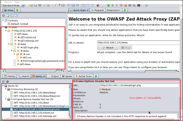 پس از آن که اسکن پایان یافت، در پنل سمت چپ سایتهایی که کراول شدهاند را میبینید. در بخش Alerts پنل چپ همه یافتهها را همراه با توضیحاتشان میبینید.