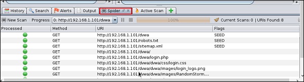 گام پنجم: روی Spider کلیک کنید تا همه لینکهایی که اسکن شدهاند را ببینید.