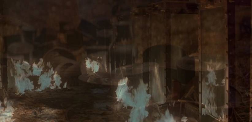 نمایی قدرتمند که هواپیمای خلبان فریر را در حال سوختن در آتش نشان میدهد.